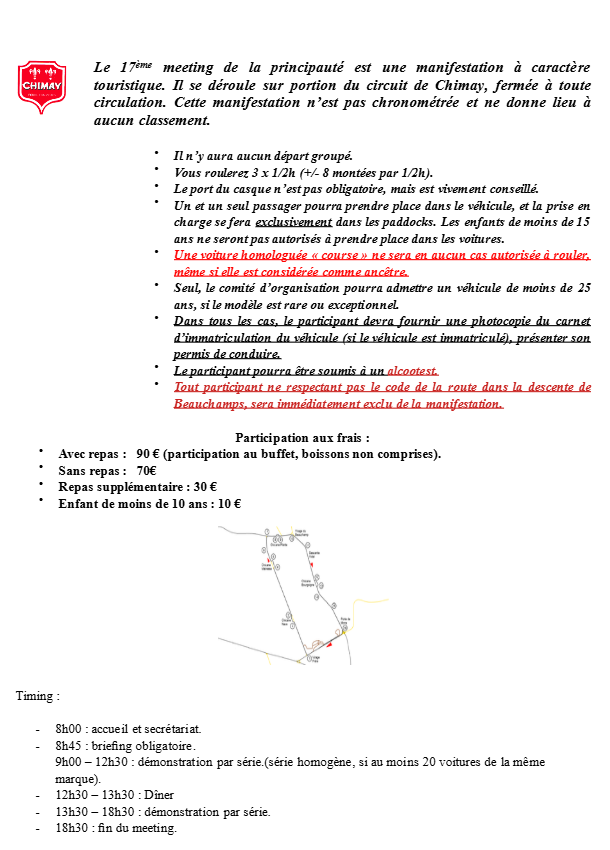Le 17ème Meeting Historique de la Principauté est une manifestation touristique pour véhicules de plus de 25 ans qui se déroule sur une portion du Circuit de CHIMAY, fermée à toute circulation. Cette manifestation n’est pas chronométrée et ne donne lieu à aucun classement.